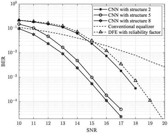 As shown in Figure 8, the CNN equalizer could improve the BER performance compared with the conventional equalizer in [18] and the decision feedback equalizer (DFE) with a reliability factor in [2]. In addition, branch structures could achieve better performance than straight structures. However, the performance of Structure 4 was similar to that of the straight structure. Because Structure 4 has excessive layers (a long network) and the skip branch connects only to the beginning layer from the perspective of the long network, the weights were not updated completely. This led to Structure 4 and the straight structure achieving similar performance. In addition, we designed Structures 7 and 8 with skipped branches that skipped two and three layers, respectively. Notably, Structure 8 achieved a better performance than Structure 7. When Structure 8 skipped three layers, the parameter information was updated more easily than in Structure 7, with two layers skipped. In other words, Structure 8 reduced the vanishing gradient better than Structure 7. Therefore, Structure 8 improved the BER performance better than Structure 7. Generally, our proposed model achieved a gain of 3.5 dB at a BER of 10−3 compared to the previous model.