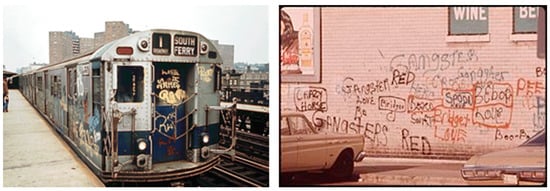 - McAuliffe, C.; Iveson, K. Art and crime (and other things besides…): Conceptualising graffiti in the city. Geogr. Compass 2011, 5, 128–143. [Google Scholar] [CrossRef]