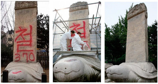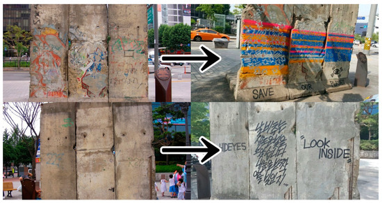 There was an incident in which a young Korean artist damaged part of the Berlin Wall, a piece of which he donated to the Seoul Metropolitan Government in hopes of peace on the Korean Peninsula. This case, shown in Figure 2, was criticized in Korea at the time and became an important example of how graffiti undermines the importance of cultural properties and becomes a problem [20].