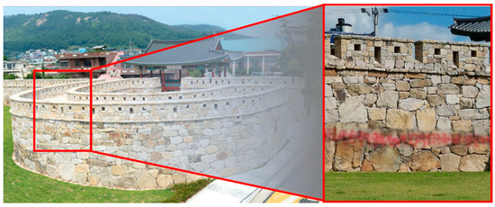 Eonyangeupseong walled town damaged with graffiti, Ulju, Korea.