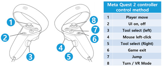Roblox is generally accessed using a PC or mobile device. To improve user interaction and painting experience with the tools, we developed a method for improving immersion through a VR input device. Figure 5 shows the operation method of a Meta Quest 2 controller, which is a VR device, in Roblox.