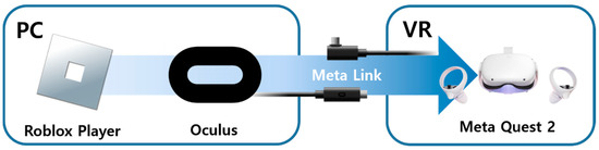 Figure 6 shows how the Roblox software and VR hardware are connected. The VR controller input can be processed using programming. The VR controller can be programmed to recognize movements and button clicks using a Lua script. Tools can be developed to create graffiti in VR. These tools should allow users to draw using a VR controller by leveraging its movement and location data. In order to start accessing Roblox using VR, install and run the Oculus PC app on your computer. Additionally, create a user interface (UI) within the VR environment that enables users to choose colors. Instead of traditional UI elements, VR controllers can be used to select colors from color palettes. If MetaQuest 2 is used, the meta-link functionality can be enabled. Turn on your Meta Quest 2 device, navigate to the “Settings” menu, select “Device”, and activate “Meta-Link”. Finally, install and run “Roblox Player” on your PC. Ensure that the “Meta-Link” is enabled on your MetaQuest 2 device before launching “Roblox Player”.