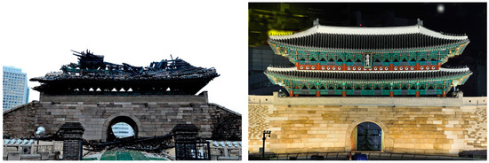 However, as shown in Figure 7, from the 10th to the 11th of February in 2008, Sungnyemun was burned by arson [33]. This emphasized the importance of cultural properties and their management and remains a symbol that raised awareness of the fact that descendants should not neglect to preserve cultural heritage. Fortunately, Sungnyemun has been rebuilt, and many domestic and foreign tourists have visited it to experience the history and traditions of the Joseon dynasty and the cultural values of Korea [34].