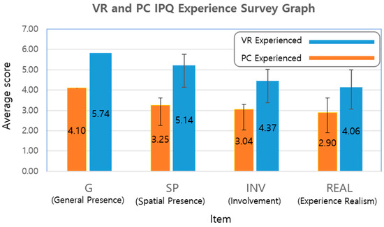 Figure 9 and Table 4 show the results of the IPQ when using a PC and VR. Item “G” exhibited the highest result at 5.74 points. “SP” approached 5.14 points (SD = 0.63). The scores of “INV” and “REAL” were both above-average, with 4.37 points (SD = 0.64) and 4.06 points (SD = 0.93), respectively. As a result of the PC survey, the scores of items “G”, “SP”, “INV”, and “REAL” were 4.10, 3.25 (SD = 0.36), 3.04 (SD = 0.25), and 2.90 (SD = 0.71), respectively. The VR users scored higher than the PC users. This analysis confirmed that the participants using the VR devices experienced higher levels of local presence, immersion, and realism in the virtual world than those using the PC devices. Also, if this score was converted into an adjective grade, it would be displayed as “normal”. For our qualitative evaluation, we collected what the participants felt after the user experience through the last question of the survey. VR provided users with a 360-degree 3D environment, making them feel as if they had jumped into a real-world-like environment. Through VR controllers or hand-tracking functions, users can directly interact with the environment with their hands or body movements. VR allowed the participants to interact with people far away as if they were in the same space and experienced a new social experience through the multiplayer function. Therefore, we can apply the proposed VR system.