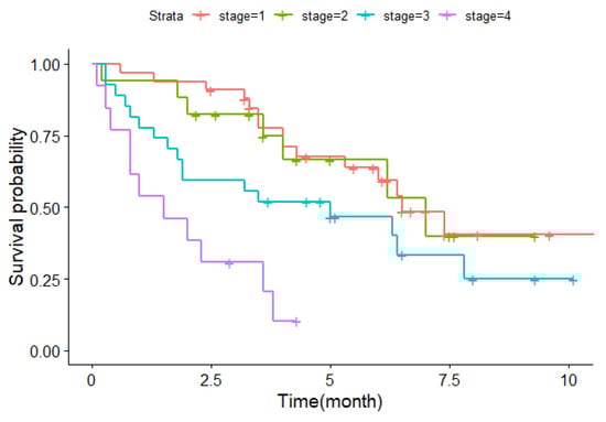We used two predictor variables to make survival time predictions: the stage of the disease and the age at the diagnosis of larynx cancer. Since the “stage” is a categorical variable, we created three dummy variables for stages 2, 3, and 4, with stage 1 as the default reference group. The survival probability of patients at various stages and time intervals can be observed in the following Kaplan–Meier plot (Figure 1):