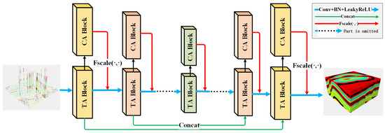 In our network architecture, we place particular emphasis on the correlations among different dimensions and the inconsistency in the horizontal and vertical variations of geoscientific data. Traditional deep learning methods often overlook these interactions and data characteristics among dimensions, leading to insufficient feature extraction and lower accuracy when dealing with multidimensional geoscientific data. Attention mechanisms, on the other hand, can effectively overcome this limitation. There has been substantial research on convolutional attention mechanisms [31,32,33,34], and, in this paper, we introduce the combined attention mechanism consisting of the TA Block and CA Block.