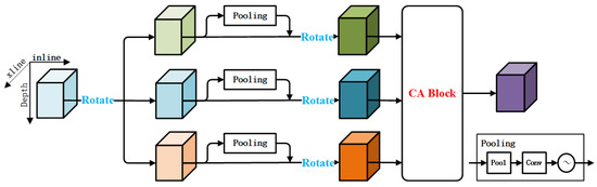 CA Block: during the interaction among inline, xline, and depth dimensions, we interact two dimensions at a time, resulting in three joint channels: inline–xline, inline–depth, and xline–depth. To conform to the irregular lateral and longitudinal distribution of geoscience data more, emphasizing inline–xline attention while weakening inline-depth and xline–depth attention, we introduce the channel attention mechanism. Through the squeeze and excitation modules, we learn the weight of each joint channel, allowing the model to adapt better to the differences and correlations between different channel data. The architecture of the CA Block will be detailed in Section 2.2.2.