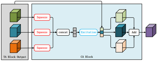 In the architecture of the CA Block, as shown in Figure 3, it can be seen that, after the TA Block outputs the feature data of the three joint channels, a squeeze operation must first be performed. This operation encodes the entire spatial feature on one channel as a global feature value, i.e., a scalar, achieved using global average pooling. Subsequently, through concatenation, an excitation operation captures the relationships between channels, learning the attention weights between channels. Finally, multiplying the channel attention weights with the output feature data of the joint channels completes the differentiation of attention to the joint channels.