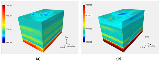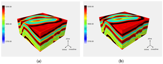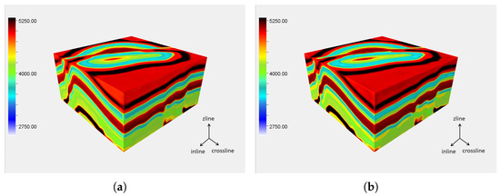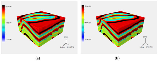 To compare the effects of basic 3DUnet and the constructed JointA 3DUnet network’s three-dimensional interpolation, we use both networks to interpolate the sampled synthetic data. To control the singularity of the dependent variables, the inputs, loss functions, and training methods of the two networks are the same, and the input data are a randomly sampled 10% of the synthetic data. The obtained three-dimensional velocity field is shown in Figure 5. From Figure 5, neither 3DUnet nor JointA 3DUnet has been able to achieve an ideal interpolation effect. In the areas with layer undulations and low values, the interpolation results of both networks are uneven. The reason for this phenomenon is that the receptive field of the convolution kernel is too small, and the network cannot learn useful features in positions with large data loss. Therefore, this paper introduces dilated convolution to increase the receptive field of the convolution kernel.