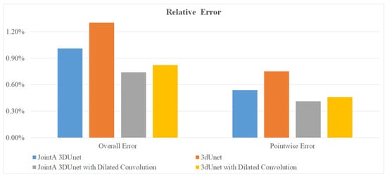 From Figure 7, it can be observed that JointA 3DUnet outperforms the traditional 3DUnet in terms of observation point relative error and overall relative error. Compared with 3DUnet, the JointA 3DUnet without adding dilated convolution reduces the overall relative error by 22.31%, and the relative error of observation points by 28%. After adding dilated convolution, the errors of both JointA 3DUnet and 3DUnet decrease, but the error of JointA 3DUnet is still the smallest. Compared with 3DUnet, the overall relative error of JointA 3DUnet decreases by 22.77%, and the relative error of observation points decreases by 21.43%. Therefore, the interpolation results of JointA 3DUnet are more accurate and better than those of 3DUnet.