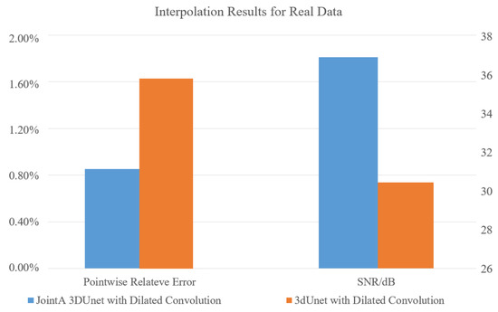 Figure 9 displays the interpolated result images in real data. It can be observed that, in the interpolation process of real data, the combination of 3DUnet and dilated convolutions leads to discontinuous layers in high value areas, while the integration of JointA 3DUnet and dilated convolutions can overcome this difficulty.