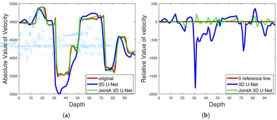Although the observation point relative error of 3DUnet is also lower, the overall effect is not ideal. This is due to the training method used. The loss function defined in this paper fits the speed data of the observation point positions. As the number of training times increases, even the traditional 3DUnet can fit the observation points. However, the missing parts of the non-observation points need to be generated by network interpolation. The CNN module in the network implicitly undertakes the role of using the correlation in the data to learn its internal structure’s prior information. The construction of the CNN model is crucial for the interpolation results of the missing positions. A large receptive field, multi-scale information, and three-dimensional spatial dimension interaction can help the CNN model to interpolate more suitably the missing speed data around while fitting the speed data of the observation points, thus generating a more accurate three-dimensional velocity field. Overall, the interpolation effect of JointA 3DUnet combined with dilated convolution is better, being able to recover the real speed values of the synthesis more accurately.