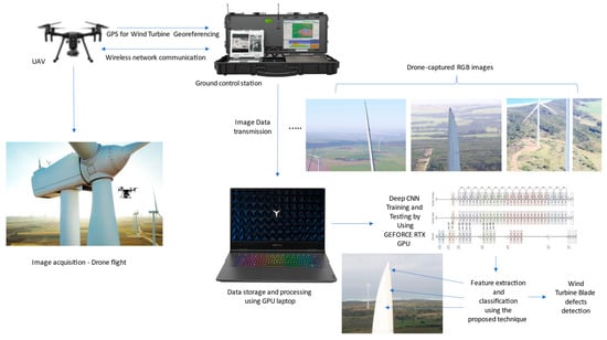 Based on the WTG component and material identifier, the inspection results can categorize the damage. For the two-megawatt wind turbine, the process takes about 15 min. When the drone lands, the pilot picks it up, loads it into the back of the pickup truck, and drives to the next turbine to repeat the process. The pilot connects the drone and tablet to the internet at the end of the day, and all data is spontaneously transferred to the analytics stage, where the client or owner of the wind farm can access and interact with their data. Figure 1 depicts the entire scheme developed for UAV-based inspection of a utility-scale wind farm.