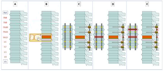 Considered configurations of the PFS: (A) physiological (P), (B) with a fracture of the Th12 vertebra (F), (C) with four-segment fixation (LSF4), (D) with four-segment fixation with one connector (LSF4 TC1), and (E) with four-segment fixation with two connectors (LSF4 TC2).