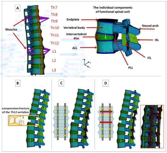 For all configurations of the thoracolumbar spine model, numerical simulations were conducted by applying a moment of force of 7 Nm [17], similar to experimental tests. The load was applied to the superior endplate of the Th7 vertebral body. In each case, the models were fixed by eliminating all degrees of freedom from the nodes on the inferior endplate of the L3 vertebral body and in the muscle nodes.