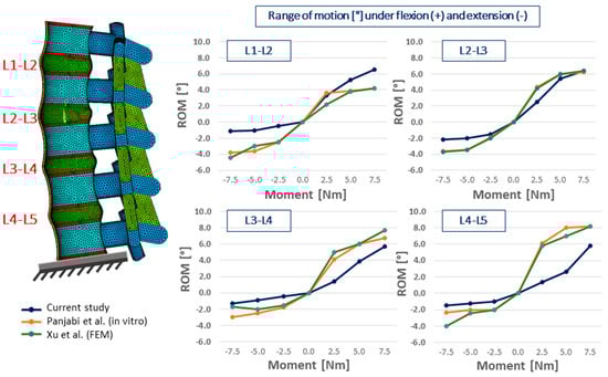 The validation process was aimed at checking the degree of compliance of the adopted assumptions of the numerical model representing the biomechanics of the thoracolumbar spine with the real experimental conditions. As there are few studies on the thoracolumbar spine in the available literature, validation was carried out for the lumbar spine (L1–L5). Three cases of loading action were analyzed: compression (for the forces of 300 N and 500 N), flexion, and extension (for the moments of a force of 2.5 Nm, 5.0 Nm, and 7.5 Nm). In each case, the load was applied to the superior endplate of the L1 vertebral body. In addition, the models were fixed by eliminating all degrees of freedom of the nodes on the inferior endplate of the L5 vertebral body.