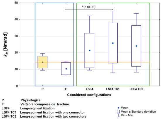The bending stiffness coefficient obtained for specimens with a fracture was approximately 28% lower than the value obtained for the physiological system. The introduction of LSF4 resulted in a significant increase in the stiffness coefficient by approximately 49% compared to the values observed for P. When connecting the rods with transverse connectors in the four-segment fixation, there was an increase in the coefficient compared to four-segment fixation without connectors. In the case of configurations LSF4 TC1 as well as LSF4 C2, the average increase ranged from 2 to 4 Nm/rad (Figure 4). Furthermore, it was demonstrated that statistically significant differences existed between the values obtained for F and LSF4 TC1 (p = 0.03).