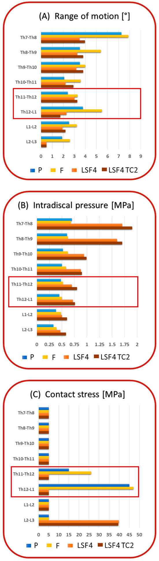 Range of motion of the individual functional spinal units (A), intradiscal pressure in individual intervertebral discs (B), and stresses on the articular facets (C) for considered configurations: physiological (P), with a fracture of the Th12 vertebra (F), with four-segment fixation (LSF4), with four-segment fixation with two connectors (LSF4 TC2).