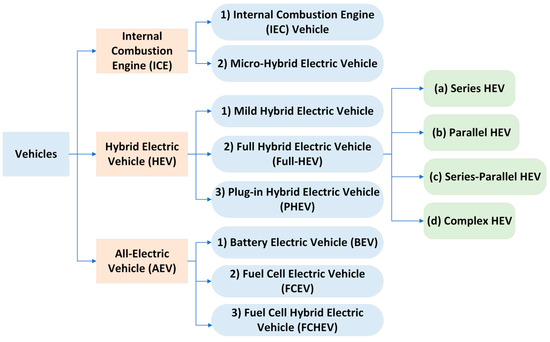 The advancements in vehicle technology have resulted in the creation of transportation systems that are cost-effective, environmentally friendly, and innovative. The development of these systems can be broken down into three categories: internal combustion engine vehicles (ICEV), hybrid electric vehicles (HEV), and electric vehicles (EV). ICEVs rely solely on gasoline-powered internal combustion engines, while EVs utilize electricity as their primary energy source through batteries, ultracapacitors, fuel cells, etc. HEVs are a combination of both ICEVs and EVs. As shown in Figure 3, the categorization of vehicles into different types of hybrids is determined by the hybridization factor indicated in Equation (1) [14,15], which is represented as the proportion of electric power to the total power.