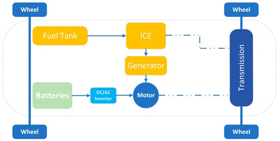 Plug-in HEVs are another form of HEV that enable to charge the energy storage system from an external source. Besides the ICS, recharging the ESS is made possible by linking it to the electrical grid. This feature allows for the use of a larger ESS, thereby extending the vehicle’s range. Figure 4 displays a schematic diagram of a series-parallel HEV [23].