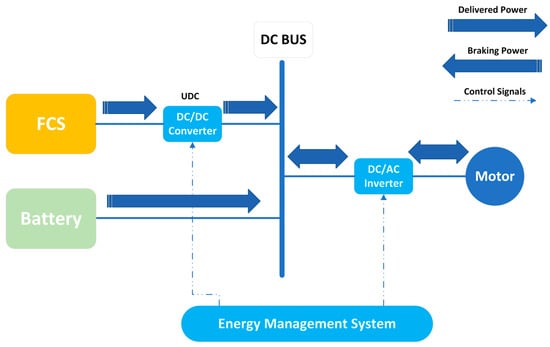 Polymer electrolyte membrane fuel cells (PEMFCs) are the best choice for vehicles due to their high-power density, low operating temperature (60–80 °C), low pressure, and resistance to corrosion over other fuel cell types [27,28]. The hydrogen used in FCEVs can be obtained either by storing it in a tank utilized on the vehicle or by processing it from fuel. Figure 5 depicts the drivetrain configuration used for FCEVs [29]. FCEVs are adequate for constant power source, except for sudden changes in loading, making them ideal for slower vehicles like forklifts, submarines, trams, buses, and vehicles used for handling materials. Currently, high-speed vehicles are also being manufactured with fuel cells, with notable companies such as Honda, Hyundai, and Toyota creating high-performance FCs to elevate their vehicles’ capabilities. Various EMS are being adopted to enhance fuel economy, minimize energy dissipation, and increase the vehicle’s efficiency.