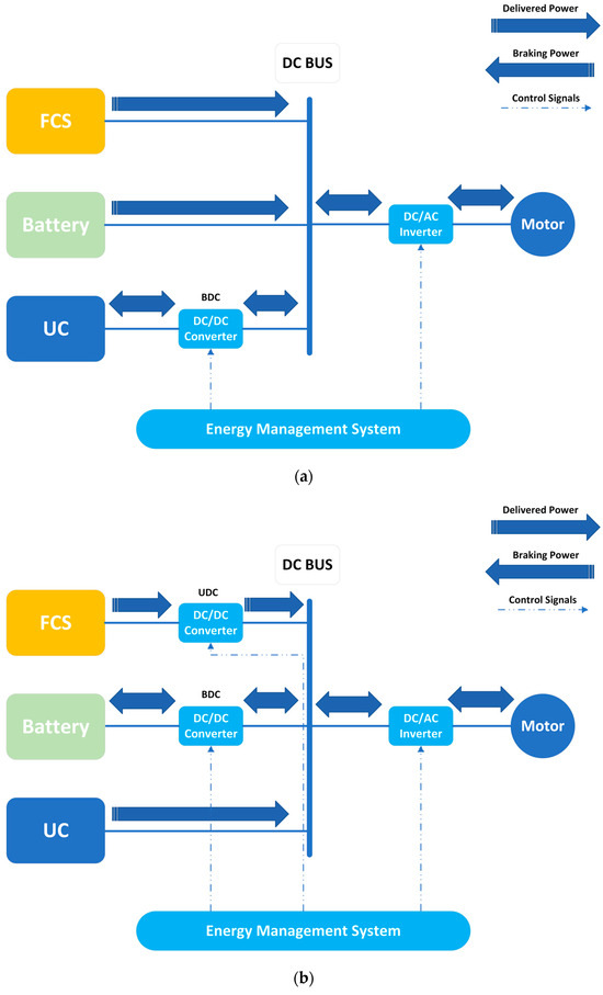 In Figure 11a, the connection of the FCS to a UDC helps to regulate the rapid changes in voltage and current in the DC bus, ultimately leading to a longer lifespan for the FCS. The FCS + battery packs + UC hybrid configuration is seen as the optimal solution for energy recovery during braking and for meeting the power needs during starting, hill-climbing, and acceleration [69]. However, this hybridization approach comes with challenges such as high production costs, difficulty in matching energy sources’ parameters, and complex energy management systems. As a result, this combination is still technically underdeveloped and challenging to implement on a commercial scale. In conclusion, each topology has its unique features, and the best option can be determined by evaluating the characteristics of each topology and reviewing relevant models, as outlined in Table 2.