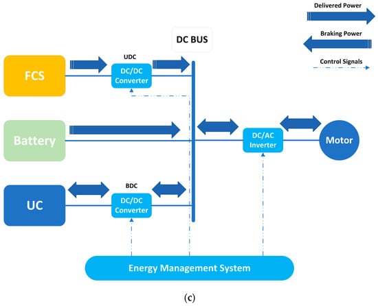 For a vehicle to exhibit optimal acceleration, it requires both high power density and high energy density [63]. Taking advantage of the complementary benefits offered by batteries and UCs, the combination of FCS, battery, and UC hybridization results in a more efficient distribution of energy under various operating conditions [37,64]. Schaltz et al. [65] conducted a study on various designs of the FCHEV and found that FCS + battery packs + UC system excelled in reducing both mass and volume, enhancing efficiency, and increasing the battery packs’ lifespan, all while maintaining the same power as the FCS. Similarly, the FCS + battery units + UC hybrid configuration was introduced by Xie et al. [66], as portrayed in Figure 11a, where the FCS offers the load’s average power, the battery supplies supplementary power during high-power load, and the UC delivers transient power and stabilizes the bus voltage. Additionally, the current generated while braking is absorbed by the UC to protect the battery from high current impacts. Figure 11b [67] and Figure 11c [68] show the hybridization topologies which are beneficial in increasing the FCS’ lifespan.