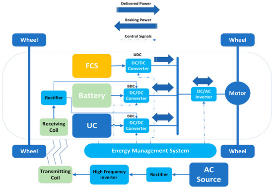 AEVs rely solely on electrical energy for their operation. There are six power transfer methods for AEVs which have been studied and noted in [24]. AEVs can be divided into three categories based on their energy source: battery electric vehicles (BEVs), FCEVs, and FCHEVs. The BEVs and FCEVs are similar and have only one power source, while FCHEVs have a hybrid power source composed of both battery and FC, or UC and FC, or UC, battery, and FC.