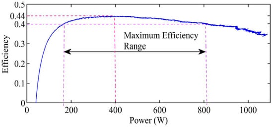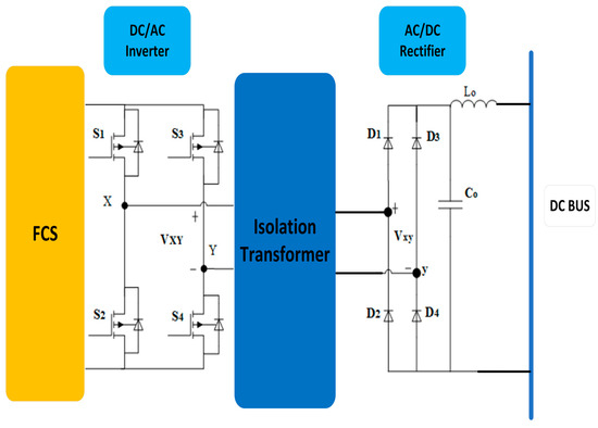The FC is directly connected to the motor’s DC bus in Figure 8, while the battery is linked to the DC bus through a DC/DC bi-directional converter (BDC). The BDC’s basic function is to maintain a stable output voltage [44]. One of the most attractive BDC topologies is the dual active bridge [45]. The simplicity of connection and straightforwardness of implementation are the benefits of this connection approach. Additionally, the BDC enables the adoption of batteries with low voltage level and enhances the battery’s consumption [46]. Nevertheless, using a DC/DC converter decreases the system efficiency. As a result of the direct connection of the FCS to the DC bus, the FCS terminal voltage determines the voltage level of the DC bus. This means that variations in FCS power can cause significant fluctuations in the bus voltage level, particularly in urban environments characterized by frequent and heavy load variations. The misalignment between the voltage levels of the FCS and bus voltage can cause a reduction in FCHEV performance.