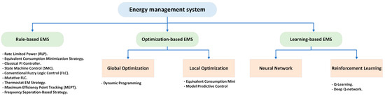 Numerous optimization goals in the field of energy management systems (EMS) for fuel cell hybrid electric vehicles (FCHEV) revolve around addressing the issue of fuel economy as the dominant optimization objective [75]. Nonetheless, challenges remain, including the considerably high operational cost of fuel cells as well as their limited lifespan. Consequently, numerous investigations have explored an alternative optimization objective: extending the lifespan of the power system [76]. The categorization of EMSs is illustrated in Figure 15.