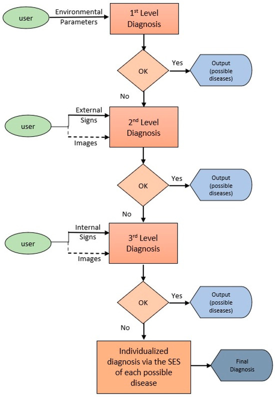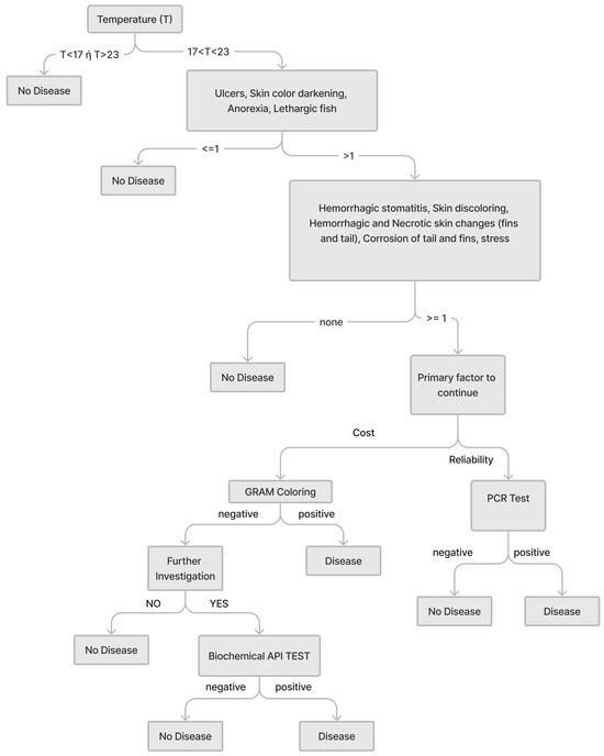 The above-produced diagnostic SESs are autonomous; that is, each one of them is dedicated to one disease. Each SES essentially represents the steps that one must follow to arrive at a diagnosis for the particular disease. Each system usually starts with questions about environmental parameters, such as temperature or the average weight of the fish, continues with questions about external clinical symptoms and observations from the image of the fish inside the cage, then proceeds with questions about symptoms of internal organs, the answers of which require an operation on the fish, and ends up with questions related to the results of microbiological, microscopic, or other specialized laboratory tests. In practice, it is not convenient to use the individual diagnostic systems (decision trees) independently because one would have to start exploring the trees one by one until arriving at the possible disease(s). Also, in most cases, a quick, real-time decision based on elements that can be available on-site is desirable. This is why an attempt was made to unify, in some way, the individual systems and produce a general diagnostic system based on environmental, external, and internal clinical signs, that is, parameters whose values can be specified on-site. This general diagnostic system produces an ordered list of the three most probable diseases. After that, if required, the user can proceed with the corresponding three SESs to finalize the decision; so, in this way, the number of systems (diseases) to be examined is reduced.