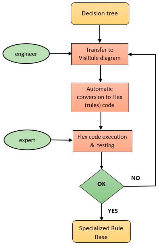 The representation of the decision trees generated by the knowledge elicitation from the experts was carried out utilizing the VisiRule (https://www.lpa.co.uk/vsr.htm (accessed on 30 September 2023)) tool. This tool is ideal for such cases, as it allows for easy drawing of decision trees through its graphical interface. So, all the decision trees were captured through VisiRule. VisiRule is a graphical tool to develop and deliver rule-based expert systems, created by LPA (https://www.lpa.co.uk/ind_hom.htm (accessed on 30 September 2023)). The user can draw from the VisiRule graphical interface a decision tree and define the points where the program will request a value for one of the variables, the type of data they receive (e.g., numeric or alphanumeric), and how the flow of the decision-making line branches, depending on their value, leading to the diagnosis result (leaves of the tree). After the decision tree is finalized as a diagram in VisiRule, it can be exported as an expert Flex rule-based system (https://www.lpa.co.uk/flx.htm (accessed on 30 September 2023)), which practically contains Prolog code. This code can be executed in the LPA Prolog runtime environment to insert values into the required input variables and output diagnostics.