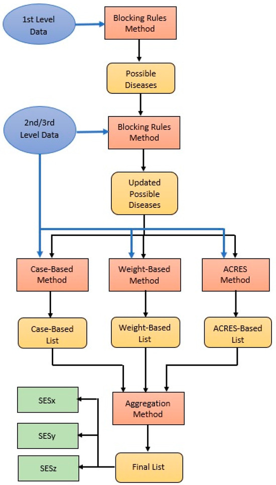 Thus, the overall system for preliminary diagnosis based on symptoms, given a new case, isolates the possible diseases and performs three separate ranking approaches (case-based, weighted, and with the trained ACRES expert system) that are combined into a final one via a voting method.