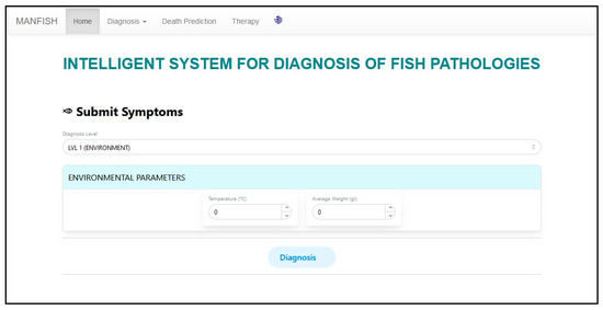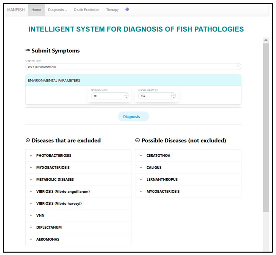 The user can use the values of the environmental parameters to reduce the possible diseases of the fish at hand. As soon as the user inserts the values and presses the “Diagnosis” button, the system displays the excluded and possible (not excluded) diseases (see Figure 8).