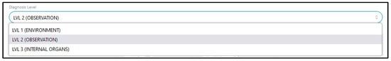 Afterwards, the user can proceed to the second diagnosis level (LVL 2) by selecting it, as depicted in Figure 9. After this has been conducted, the second-level data interface is unfolded, as presented in Figure 10, where the user selects the current second-level (external) symptoms/signs.