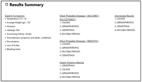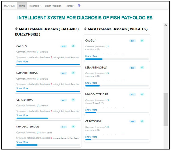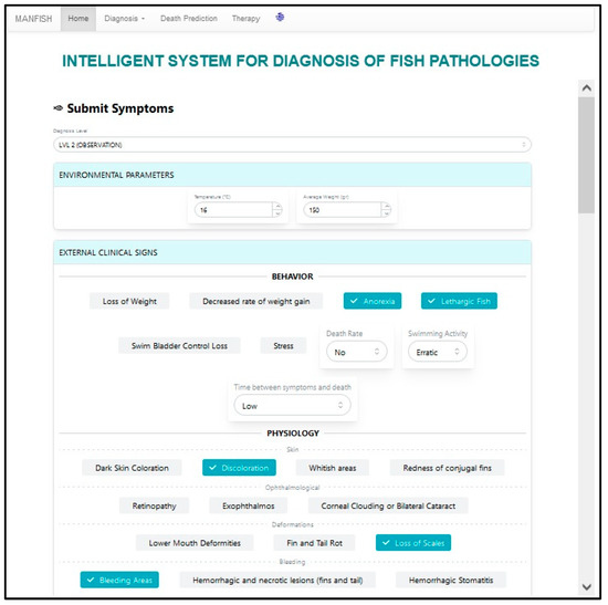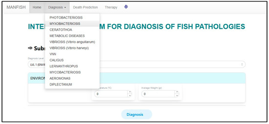 After the final list is produced, the user either accepts the result as valid or goes to further investigation through the specialized expert systems (SESs). The user selects a SES from the “Diagnosis” tab of the user interface menu, as shown in Figure 13, where the SES corresponding to “Myxobacteriosis” is chosen.