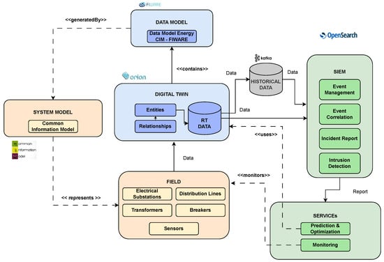 The effectiveness of such a framework is demonstrated through its application to a real-world power distribution grid in Kropa, Slovenia. In the proposed case study, a digital twin was constructed starting from the CIM-based representation of the system, while the real-time monitoring and reaction strategies are facilitated by the SIEM solution based on open-source technologies like OpenSearch. The Kropa grid’s case study provided a practical context to evaluate the digital twin’s monitoring capabilities, allowing for the analysis of data, detection of irregularities, and obtention of insights into the system’s performance and security.
