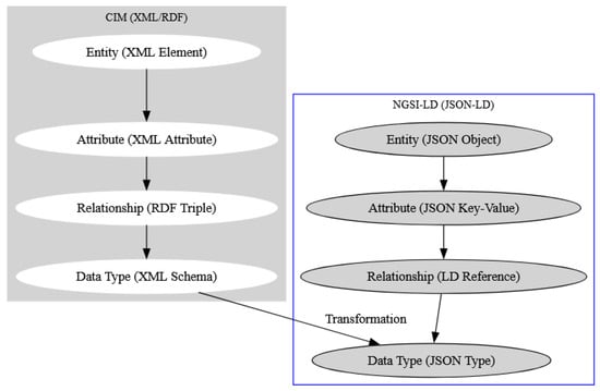 The main differences between CIM and NGSI-LD are reported in Figure 3, and can be summarized as follows: