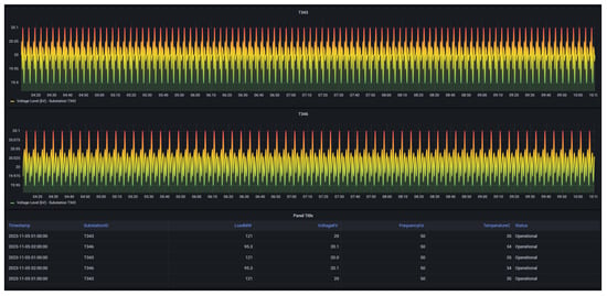 The configuration change phase, a critical juncture in the attack scenario, is addressed with OpenSearch’s ability to closely monitor and visualize operational parameters. This is achieved through a dynamic dashboard, built using Graphana, that reflects real-time data, enabling the detection of unauthorized configuration changes. The system is configured to recognize deviations from standard operational parameters, ensuring that any abnormal activity is immediately flagged. Within the scope of our research, we have developed a dashboard, illustrated in Figure 5, that displays real-time telemetry data from electrical substations. The dashboard is engineered to parse and render time-series data, capturing a range of electrical parameters that are critical to the operational integrity of power distribution systems. The data include precise timestamps (coordinated universal time—UTC), substation identifiers, electrical loads in megawatts (MW), voltage levels in kilovolts (kV), the system frequency in hertz (Hz), the ambient temperature in degrees Celsius (°C), and the operational status of each substation.