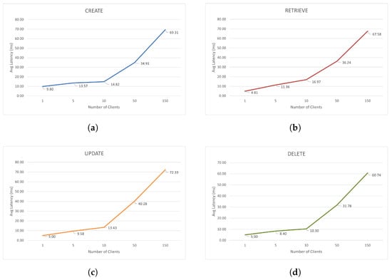 Performance analysis of CRUD operations at varying levels of client concurrency. (a) Average latency for the ‘create’ operation. (b) Average latency for the ‘retrieve’ operation. (c) Average latency for the ‘update’ operation. (d) Average latency for the ‘delete’ operation.