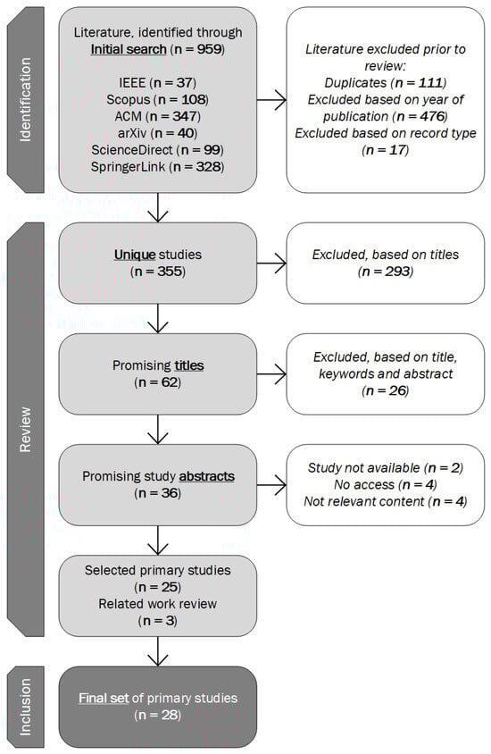 Figure 2. SLR Progression.- Phase 1: Initial search. In the first phase, we performed an initial search. It returned 959 results. During our preliminary research, we discovered works [,] that addressed the same domain and were published between 2019 and 2020. In order to avoid redundancy and repetition, we decided to focus on works published only in the last 4 years. Consequently, we added the rule that only those pieces of literature that were not older than four years were taken into further investigation. After eliminating the duplicates, we arrived at a total of 355 items after the first phase.