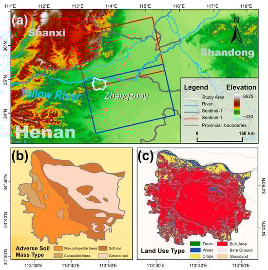 Sentinel-1A (https://search.asf.alaska.edu/#/, accessed on 10 October 2023), SRTM DEM (http://srtm.csi.cgiar.org/srtmdata, accessed on 10 October 2023). Satellite precise orbit data (https://dataspace.copernicus.eu/explore-data/data-collections/sentinel-data/sentinel-1, accessed on 10 October 2023). <Environmental Geological Survey and Evaluation of Major Cities in Henan Province-Zhengzhou City Summary Report> (https://www.ngac.cn/dzzlfw_sjgl/d2d/dse/category/fileView.do?path=/dzzlfwsjgl/admin_file/core/file/toView.do?id=4028808563f8a21c01643a6b217436c4, accessed on 30 November 2009). Landcover (https://www.arcgis.com/apps/instant/media/index.html?appid=fc92d38533d440078f17678ebc20e8e2, accessed on 30 December 2021). Baidu Street View Map, (https://map.baidu.com/@12651557.08,4106835.09,21z,87t,74.85h#panoid=09028900121707121435495398I&panotype=street&heading=140.85&pitch=19.26&l=13&tn=B_NORMAL_MAP&sc=0&newmap=1&shareurl=1&pid=09028900121707121435495398I, accessed on 30 June 2021).
