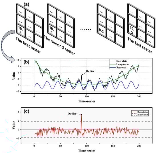 Principle of the outlier test method for each image element, the image time-series data. Raw data in the lower left corner in (a) are decomposed by (b) to the residual term (c), and the unreasonable value in (c) is judged as an outlier outlier.