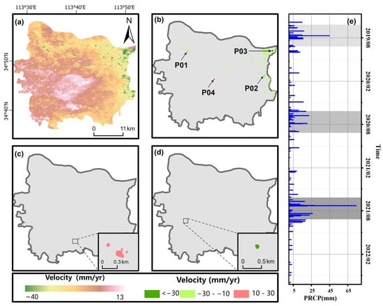 The annual average distribution map of surface deformation rate in Zhengzhou City (a), as well as the distribution maps of different levels of dangerous deformation rate development (b–d). In the legend, dark green represents the high risk rate of surface deformation, while light green and red represent the medium risk rate of surface deformation. (e) The daily cumulative precipitation of 57,083 meteorological station in Zhengzhou City from 20:00 to 20:59 (with a gray background indicating the rainy season of that year).