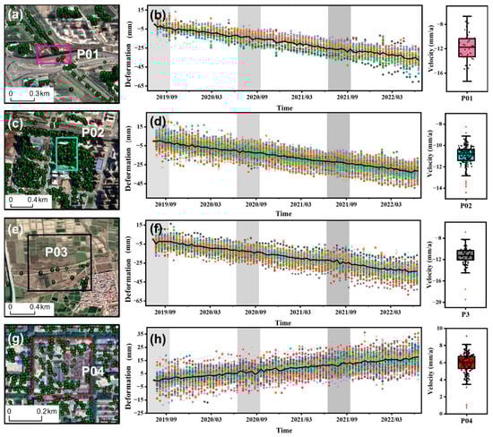 The precipitation of Zhengzhou City from May 2019 to June 2022 is shown in Figure 3e, where the gray background is the rainy season of that year, and, similarly, in Figure 4b,d,f,h, the gray background is the rainy season of the corresponding year. By observing the surface deformation of each sampling area, even around 20 July 2021, it is difficult to detect anomaly surface deformation fluctuations based on existing indicators.