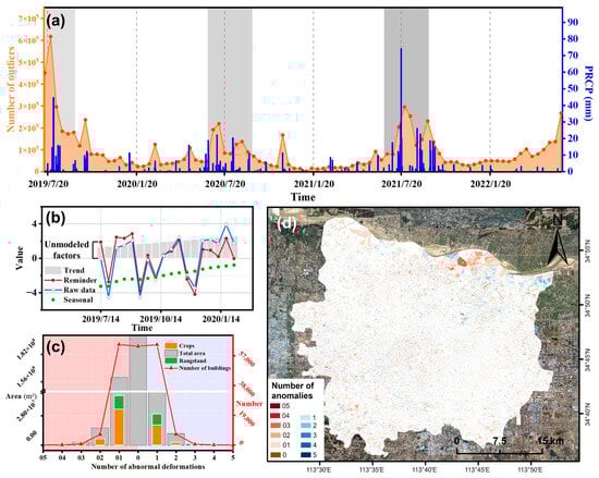 The change in the number of surface deformation anomaly grids in Zhengzhou City is shown in Figure 5a, and its fluctuation is generally the same as the change in precipitation; the number of deformation anomaly grids in the rainy season is more than before, and the larger the precipitation, the more anomalous grids. However, the number of anomalous grids appears to be abnormally high at the beginning and the end of the curve, especially in the first period, which is the starting period where the values inside the grids are all zero, but there are still about 4.5 × 105 grids determined as anomalies, which is illogical. This error occurs because when SSA decomposition is performed, ideally, the sum of the trend and period terms at the beginning of the curve would be equal to the actual values, and the trend and period terms would be unbiased over the entire time series, but these two terms at the beginning and the end of the curve cannot be modeled completely and accurately, and the un-modeled factors are incorporated into the residual terms (Figure 5b), which are not the residuals from the real surface deformation, and, thus, these large numbers of false residuals are categorized as outliers in the boxplot statistics, leading to this error. However, as the sequence advances, this false residual rapidly becomes smaller until the problem described above reappears at the tail end of the approach. Although the false residuals are not conducive to counting the outliers in the first and last parts of the sequence, this is not entirely a bad thing because the boxplot counts all the residuals of the entire time series, and the false residuals can be introduced as noise, which makes the judgment indexes in the counting of outliers stricter and improves the accuracy of the identification of outliers in the middle of the sequence.