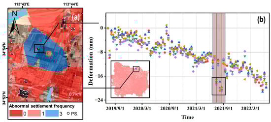 Remote sensing technology has enabled the implementation of multi-scale and multi-frequency monitoring methods: from small-scale detection at high update frequencies to large-scale monitoring at low update frequencies and providing high update frequencies when necessary. Satellite-based synthetic aperture radar interferometry (InSAR) is an effective satellite-based remote sensing method for monitoring surface deformations over large areas with millimeter- to centimeter-scale vertical accuracy and bi-weekly or monthly temporal resolution []. However, the application of D-InSAR in monitoring surface deformation is usually affected by incoherence and atmospheric effects. In this context, multi-temporal InSAR processing methods have been proposed, such as the permanent scatterer interferometry (PS-InSAR) method [] and small baseline set (SBAS-InSAR) methods []. For urban surface deformation, PS-InSAR is one of the most widely used and mature techniques in the field []. For geologically stable cities, surface deformation is a slow process of change, and potential areas of deformation hazards are difficult to identify in a short period of time using existing hazard assessment indicators. For example, the deformation of a slowly subsiding site tends to show a linear downward trend with a certain periodicity in a short inter-annual time period, but when the surface deformation values of a site repeatedly show anomalies beyond the original evolutionary characteristics, the site can be considered as a surface deformation-sensitive area. For example, Li et al. [] identified deformation anomalies by counting the residual terms decomposed from a dam deformation time series. Shi et al. [] used a deep learning method to examine the deviation of the expected value of surface deformation from the actual value and judged values larger than the standard deviation of all deviations from the statistics as anomalies. Although surface deformation anomalies may not vary significantly in numerical terms, increasing the number of anomalies can lead to structural fatigue and pose safety hazards for buildings. Therefore, for a city like Zhengzhou, which has been geologically structurally safe and persistently stabilized by human impacts in recent years, surface deformation anomalies can be used to identify hazardous or susceptible areas [].