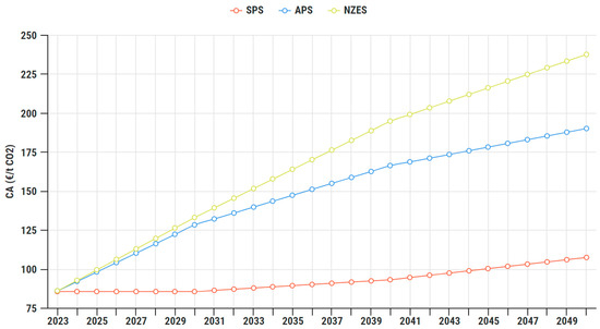As previously stated, the carbon tax will be implemented in the shipping sector in 2024, and at first, it will be applied to commercial cargo and passenger ships of above 5000 GT, but this work investigates the possibility of its extension to other ship types. The current price of a carbon allowance (September 2023) is around EUR 85/t of CO2, but the International Energy Agency predicts that this value will grow up to EUR 238/t of CO2 by 2050 [87]. According to the World Energy Outlook [88], there are three Carbon Allowance (CA (EUR/t CO2)) scenarios for 2030, 2040, and 2050., i.e., the State Policies Scenario (SPS), Announced Pledges Scenario (APS), and Net Zero Emissions by 2050 Scenario (NZES), where: