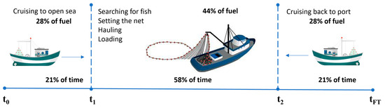 Data on operating times are crucial for investigating the energy consumption of purse seiners. Their working time varies daily and depends on weather conditions and fish season (and on whether catch limitations are in force) [91]. A typical purse seiner follows the timetable detailed in Figure 4: starting the fish trip at time t0, cruising to the open sea till time t1; then, the fishing operation, i.e., harvesting the fish, occurs till time t2, when the purse seiner starts to return to the port.