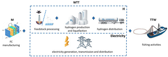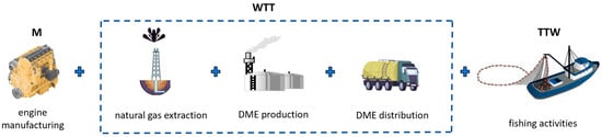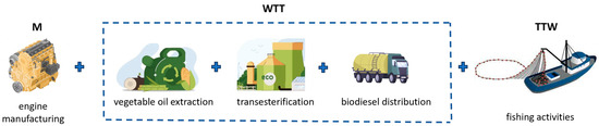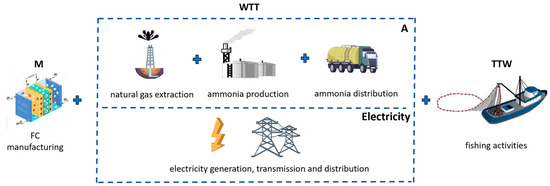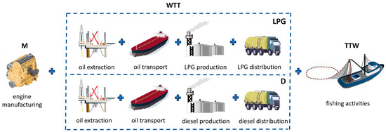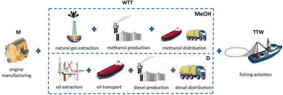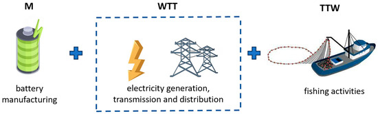 Emissions from the WTT and M phases were obtained using the LCA software GREET 2022 [82], whose database contains many products (fuels) and stationary and transportation processes related to their life-cycles. The TTW phase refers to the ship’s operation, i.e., fishing activities. During that time, fuel is used onboard the ship for its propulsion, gear operation, and other activities (hotelling, refrigeration of fish, etc.). Fuel combustion results in tailpipe emissions, ETTW (kg), which are calculated by multiplying emissions factors, EF (kg gas/kg fuel), by fuel consumption, FC (kg), according to the following equation: